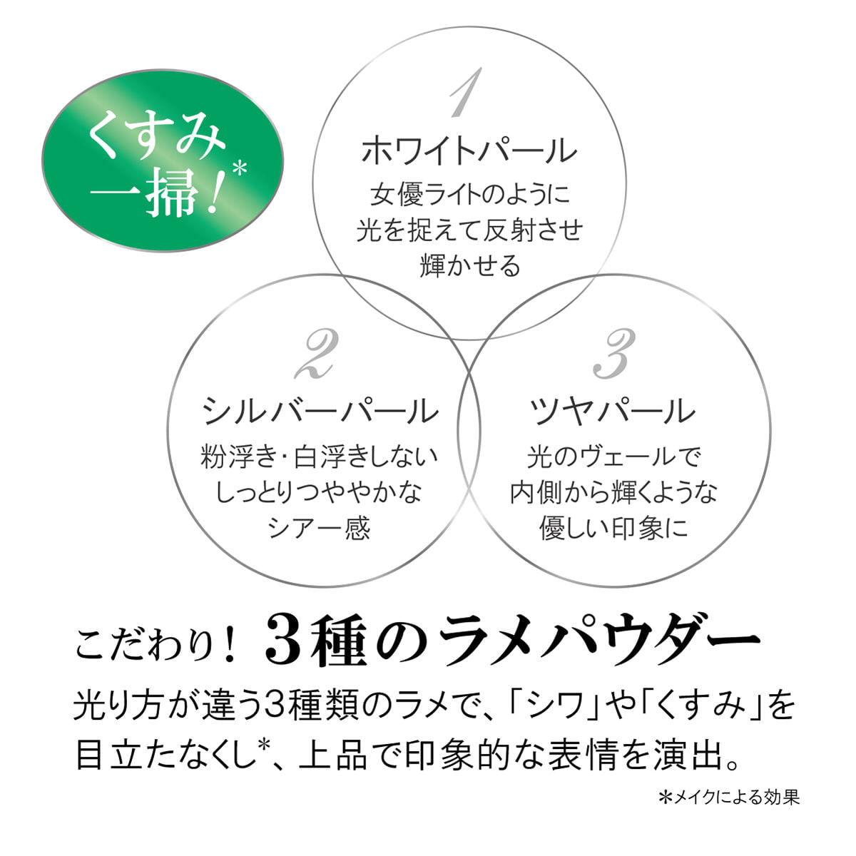 光り方の異なる3種のラメパウダーが上品で印象的な表情を演出し、高密着なのに軽やかな付け心地で、ヨレず・崩れず、1日中美しい肌を保ちます。