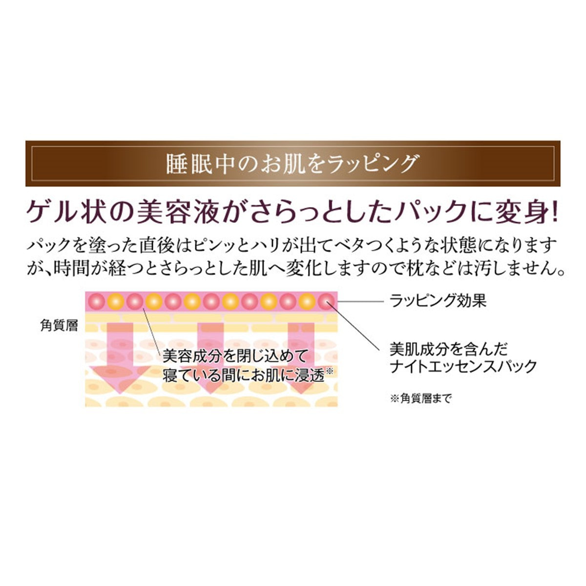 睡眠中のターンオーバーに着目したナイトエッセンスパックは、 お休み前に塗るだけの簡単液状パックです。 EGF(上皮成長因子)と厳選した美容成分がお肌をイキイキとさせ、 健やかに保ちます。