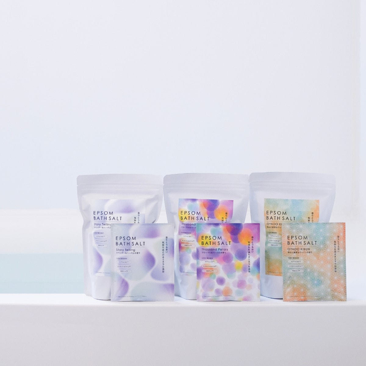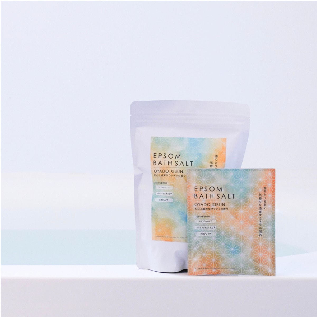 エプソムソルト(硫酸Mg(保湿成分))をメインに、エッセンシャルオイル(天然芳香成分)、天然クレイ(ベントナイト(吸着成分))を合わせました。