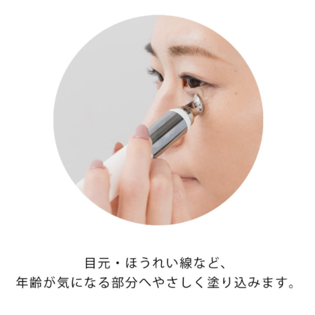 ②容器の先端を目元に当て、目頭から目尻に向かってシルバーのプレート部分を持ちながら優しくスライドさせます。